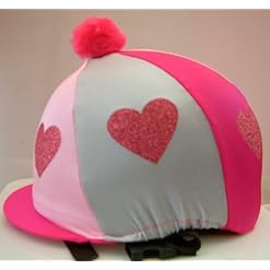 Equestrian / Horse Riding Hat cover – Pink and Silver with Glitter Hearts and Pink Pom-Pom