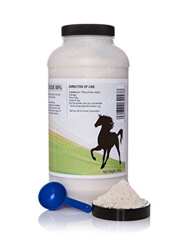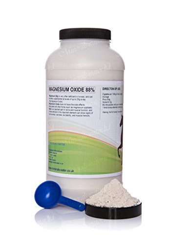 USES Some of the common uses of magnesium oxide are as follows: Magnesium plays an important part in nerve and muscle function, and horses deficient in this important element can show signs of nervousness, wariness, excitability, and muscle tremors MgO is also used in feeding other animals. It is used in leather processing, as a basifying agent on chrome tanning process. It is used in libraries for preserving and deacidifying books, as it reacts with ambient moisture to dry the book storage areas. It is a principle ingredient in construction materials and hence used for fireproofing. It is also used as a basic refractory material for lining crucibles. MgO is used as one of the raw materials for making cement in dry process plants; specifically Portland cement. It is used to reduce sweat and moisture on the hands and holds by rock climbers. Due to its excellent diffusing and reflectivity properties, it is used as a reference white color in colorimetry. If smoked onto the surface of an opaque material, it forms an integrating sphere. Due to its high dielectric strength and average thermal conductivity, it is used extensively in electrical heating as a component of -styled heating elements. USAGE DIRECTION for horses: 2g for each 100kg of the horse weight Pony 6-8g a day Horse 8-12g a day Mix the powder with your normal feed. 1 level scoop attached contain 4,5g Note: Not suitable for human consumption.