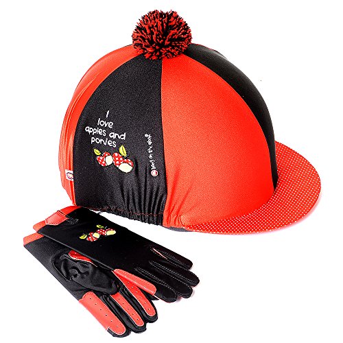 Who doesn’t love apples and ponies?! Brighten up your riding look with our Bang On The Door Apples and Ponies Hat Cover and Glove Set. Designed in eye catching black and red, and with matching cute apple motif, this set is perfectly coordinated for a smart yet fun look!