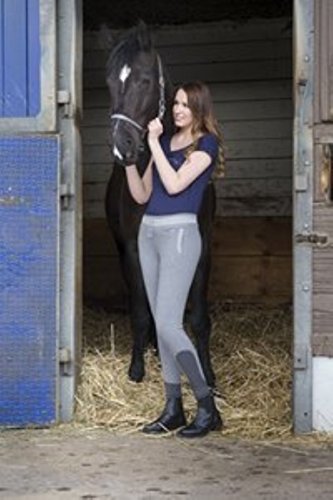 Easy to slip on breeches without a zip or a button, very comfy! Stretch lower end, 2 vertical pockets on front side and tying string. Waistband and edges of pockets feature a lamé fabric insert. Fabric knee patches, contoured seat and elasticated waistband. Composition: 75% cotton, 20% polyester and 5% elastane. Machine washable at 30°C.