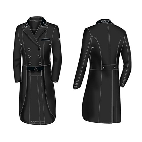 Designed to guarantee the utmost freedom of movement thanks to x-cool EVO fabric – water-repellent, extremely breathable and bi-elastic. Its perfect tailoring and the possibility to personalize the tail weight make this tailcoat the ideal choice for any dressage competition. The buttons at the sleeves as well as at the front are equipped with elaborate crystals. With silver embroidery and eco-leather at the front and back part of the collar and tone on tone rhinestones on collar front part. With Equiline-metal-label on the left sleeve. Material: 70% polyamide, 23% elasthane, 7% polyurethane. Lining: 100 % Polyester. Sizes are in german size. Matches the breeches LEXA (2013552s16), shirt CATHRINE (2060472s16), jacket KAROL (2060272s16). Text by CALEVO.