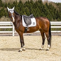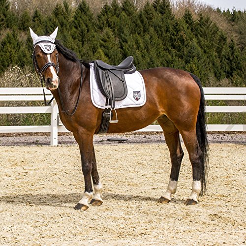 Absorbing and breathable competition saddle pad with diamond topstitching, enhanced with a braid and an Equestrian League badge patch on mounting side. Self-gripping attachment strap, and girth loop. Composition: topside in cotton twill, lining in 100% honeycomb polyester, and dual layer padding in 240 g/m² polyfill and 5 mm foam. Matches EQUIT’M E.L. Blason fly mask item No. 306 980.