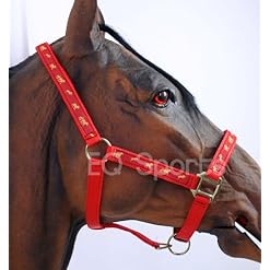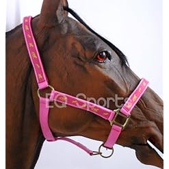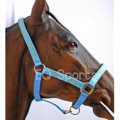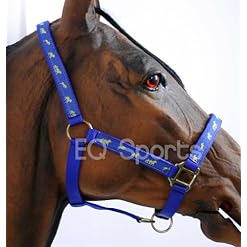 Quality nylon headcollar with horse logo pattern ribbon and brassed fittings.