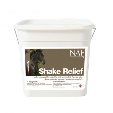 Shake Relief is an advanced, veterinary developed nutritional formula designed especially for your horse if he becomes distressed by discomfort felt in his head. Feeding your horse Shake Relief will help make him happier, ride able and ready to shake the world! Ingredients: Products from the processing of herbs (including Hops, Echinacea, Bitter orange peel (ripe), Mint, Rosehip shells, Omicha berries, Milk thistle seeds, Turmeric, Dandelion leaves, Rosemary, Blueberries, Ginger, Gingko leaves and Liquorice), Magnesium oxide, Methyl sulphonyl methane, Apiculture by-product (bee pollen), Wheat protein, Glutamine, Brewers’ yeast, Milk protein powder, White mineral oil, Fructo-oligosaccharides.