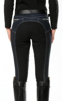 Super elastische und äußerst bequeme Reithose in trendiger Jeansoptik mit modischen, weißen Nähten, waschbarem Kunstledervollbesatz, Gürtelschlaufen und mehreren dezenten Taschen (teilweise mit Reißverschluss), waschbar bis 30ºC (bitte separat waschen!). Material: 62 % Baumwolle, 33 % Polyamid, 5 % Elasthan, Besatz: 60 % Polyamid, 40 % Polyurethan
