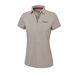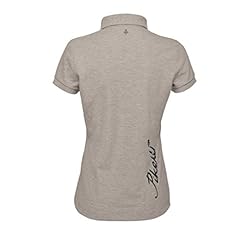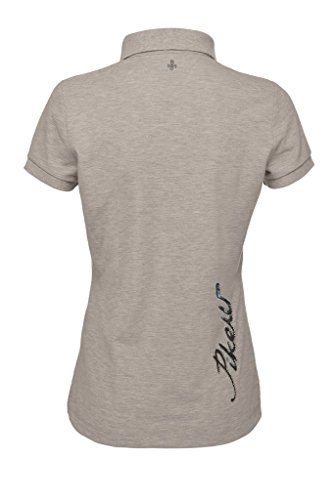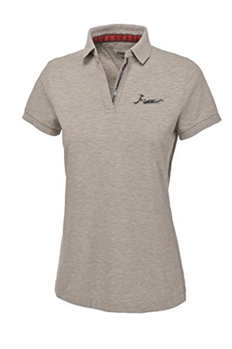 Fashionable polo shirt with small, studs- and sequin attached button-stay without buttons. With elaborate Pikeur-sequin-pearl-label on the left chest and at the back. With NG-metal-cloverleaf at the back under the collar. Material: 95% cotton, 5% elasthane, color grey melange: 47% cotton, 47% polyester, 6% elasthane. From the new NEXT GENERATION Summer Collection 2017 from Pikeur. Text by CALEVO.