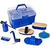 Cylinder shaped plastic bag with handle and zip closure containing plastic curry comb, hoof pick and brush, sweat scraper, dandy brush, body brush, sponge, rubber massager, large plastic comb.
