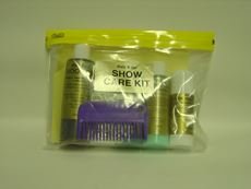 An assortment of items neatly packed in a see through zipped bag. Contains equigloss, body bath gel, mane and tail shampoo, hoof oil, show white stick, mane comb and plaiting bands.