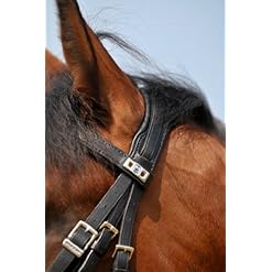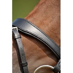 Differently designed snaffle bridle 1800 Passion from Stubben. The lightly swung noseband, browband and head piece are very soft padded. As the noseband strap is going over the top of the headpiece, the horse feels very comfortable in this bridle due to reduced poll pressure. Available in the colors black, ebony (dark brown), havanna (red brown), tobacco (middle brown), self lined. Sizes: cob, full. Text by CALEVO.