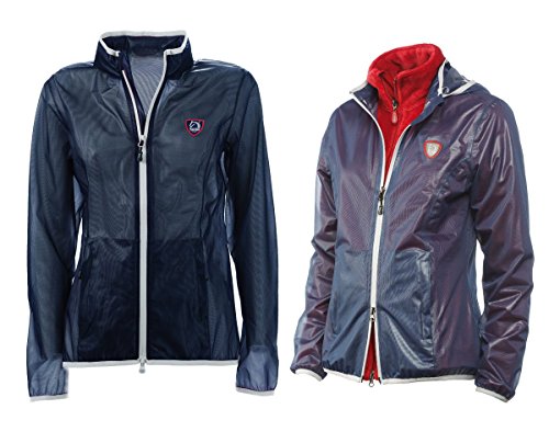 Fitted-cut, made of ultra-light polyester jacket, waterproof and breathable, seamtaped stitchings and waterproof two-ways zipper. With two concealed zipper pockets, removable hood and contrast stretch piping. Unlined, it is perfect for wearing over the show jacket and over no-waterproof jackets of the collection.