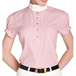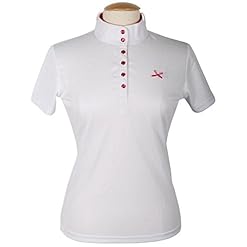 Ladies competition shirt with 3/4 zip front, shaped side panels and short sleeves. Loops on collar to attach detachable overcollar supplied or for a stock tie. Cotton front panel and collar. Durable stretch microfibre body fabric helping to wick away moisture, quick drying and colour fast. 88% polyester, 12% spandex. Machine Washable.